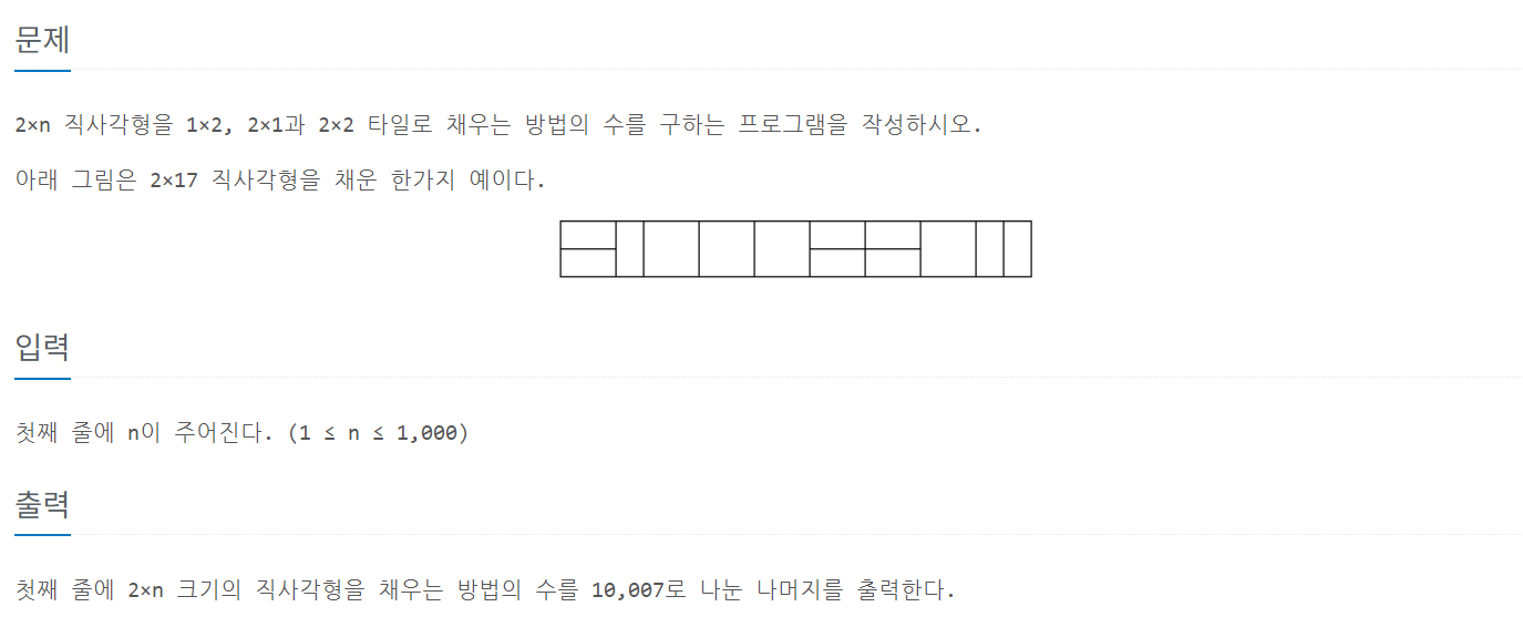 10007로 나누는 이유는 width가 1000까지 있는데 1000까지 가는 도중에 경우의 수가 int 범위를 초과하기 때문에 10007로 나눠 출력하라는 것이다.