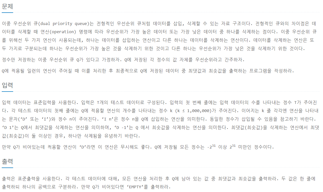 test case가 주어지고 명령이 주어질 때 명령에 맞게 큐의 데이터를 변경한 후, 큐가 비어 있으면 EMPTY를 출력하고 그렇지 않으면 큐의 최댓값과 최솟값을 출력.